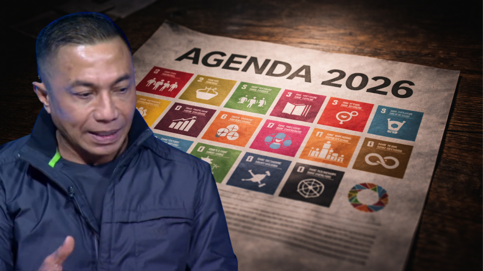Dharma kemudian membedah sebuah poster bertuliskan “2026 AGENDA” yang memuat poin-poin Sustainable Development Goals (SDGs) PBB. Ia memberikan interpretasi kontra-naratif yang mengejutkan mengenai tujuan-tujuan global tersebut:
