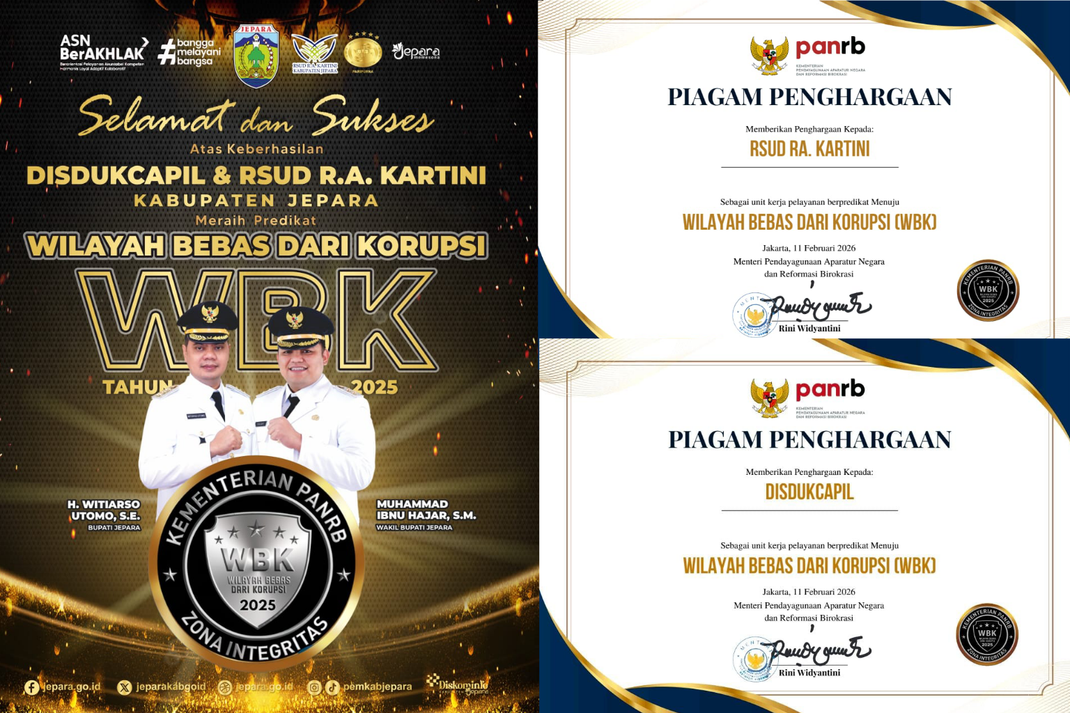Jepara, Jawa Tengah – Dua instansi di bawah naungan Pemerintah Kabupaten Jepara sukses mengukir prestasi dengan meraih predikat Wilayah Bebas dari Korupsi (WBK) tahun 2025. Penghargaan bergengsi tersebut diberikan oleh Kementerian Pendayagunaan Aparatur Negara dan Reformasi Birokrasi (PANRB) kepada Dinas Kependudukan dan Pencatatan Sipil (Disdukcapil) serta RSUD R.A. Kartini Jepara.