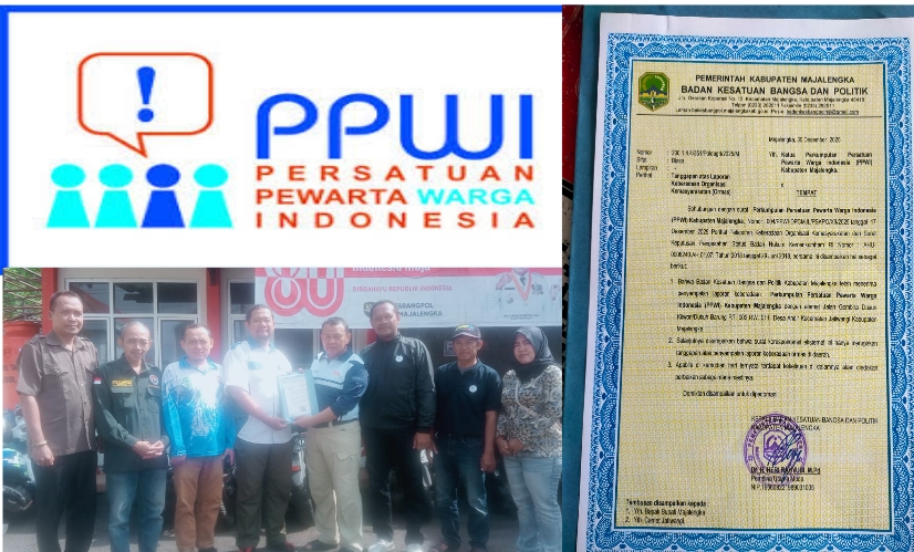 Majalengka, Jawa Barat – Eksistensi Dewan Pengurus Cabang (DPC) Persatuan Pewarta Warga Indonesia (PPWI) Kabupaten Majalengka kini semakin kokoh. Pemerintah Kabupaten Majalengka melalui Badan Kesatuan Bangsa dan Politik (Kesbangpol) secara resmi menyerahkan Surat Tanda Lapor Keberadaan (TLK) Ormas kepada pengurus DPC PPWI, pada Jumat (9/1/2026).
