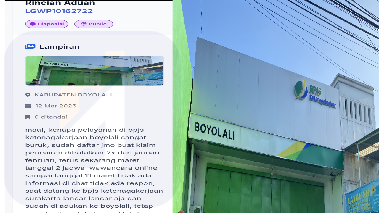 Boyolali, Jawa Tengah – Kualitas pelayanan BPJS Ketenagakerjaan Boyolali kini tengah menjadi sorotan tajam setelah warga melayangkan aduan resmi melalui kanal Laporgub pada Kamis (12/3/2026). Aduan dengan nomor tiket LGWP10162722 tersebut mengungkap dugaan praktik mempersulit hak peserta terkait proses pencairan klaim yang telah berlarut-larut sejak awal tahun tanpa kepastian yang jelas.