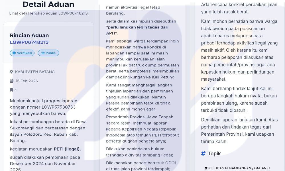 Batang, Jawa Tengah – Praktik penambangan galian C ilegal Batang di wilayah Desa Sukomangli, Kecamatan Reban, kini menjadi sorotan tajam setelah warga kembali melayangkan protes keras melalui kanal aduan resmi pemerintah, Laporgub. Berdasarkan laporan bernomor LGWP06748213 tertanggal 15 Februari 2026, masyarakat mengungkapkan kekecewaan mendalam terhadap lemahnya penegakan hukum atas aktivitas tambang tanpa izin yang diduga kuat kebal hukum.