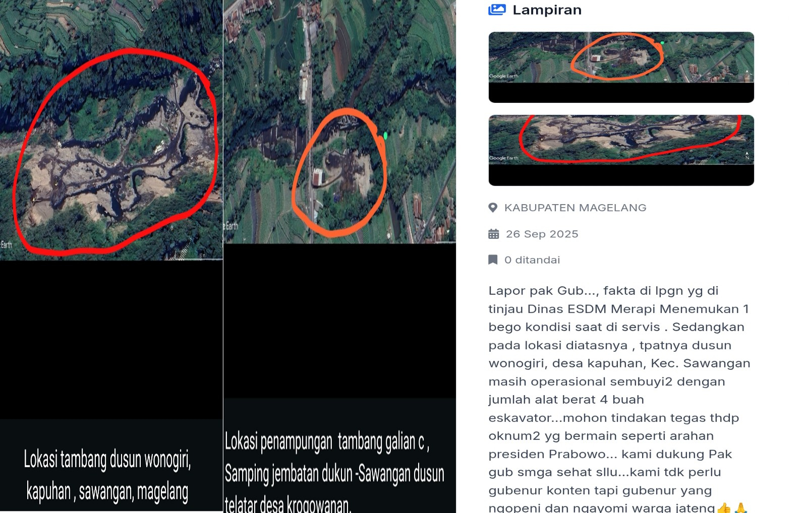 “Mohon tindakan tegas terhadap oknum-oknum yang bermain, seperti arahan Presiden Prabowo. Kami dukung Pak Gub, semoga selalu sehat. Kami tidak perlu gubernur konten, tapi gubernur yang ngopeni dan ngayomi warga Jateng,” tulis warga dalam laporannya.