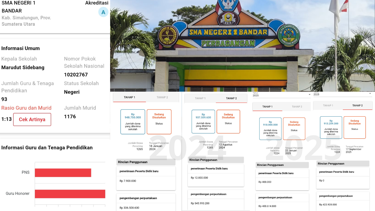 Simalungun, Sumatera Utara – Transparansi pengelolaan Dana Bantuan Operasional Satuan Pendidikan (BOSP) di SMA Negeri 1 Bandar, Kabupaten Simalungun, kini menjadi sorotan tajam. Berdasarkan laporan penggunaan anggaran tahun 2024-2025, ditemukan indikasi ketidakteraturan yang mengarah pada dugaan mark-up di sektor pengembangan perpustakaan dan pemeliharaan sarana prasarana yang nilainya mencapai miliaran rupiah.