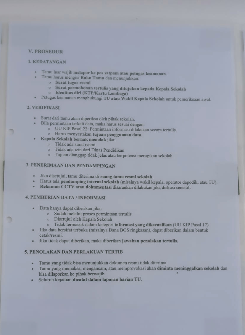 Berdasarkan dokumen prosedur kedatangan tamu yang diperoleh redaksi, SMAN 1 Bandar menerapkan aturan ketat yang mewajibkan tamu menunjukkan surat tugas resmi, identitas diri, hingga surat permohonan tertulis yang ditujukan kepada Kepala Sekolah. Bahkan, prosedur tersebut mencantumkan bahwa Kepala Sekolah berhak menolak tamu jika dianggap “berpotensi merugikan sekolah”.