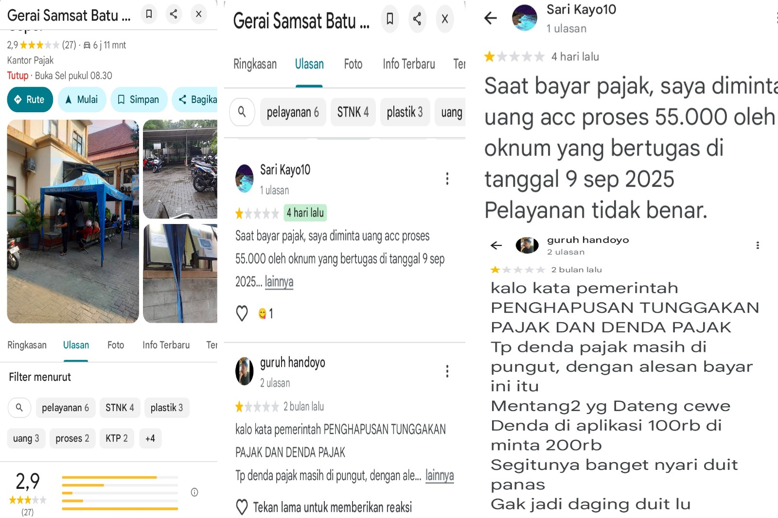 Tangerang, Banten – Dugaan praktik pungutan liar (pungli) kembali mencuat di Gerai Samsat (Sistem Administrasi Manunggal Satu Atap) Batuceper, Tangerang, Banten yang berada di bawah naungan Polda Metro Jaya. Keluhan datang dari seorang wajib pajak yang menyampaikan pengalamannya melalui Google Maps pada 9 September 2025.
