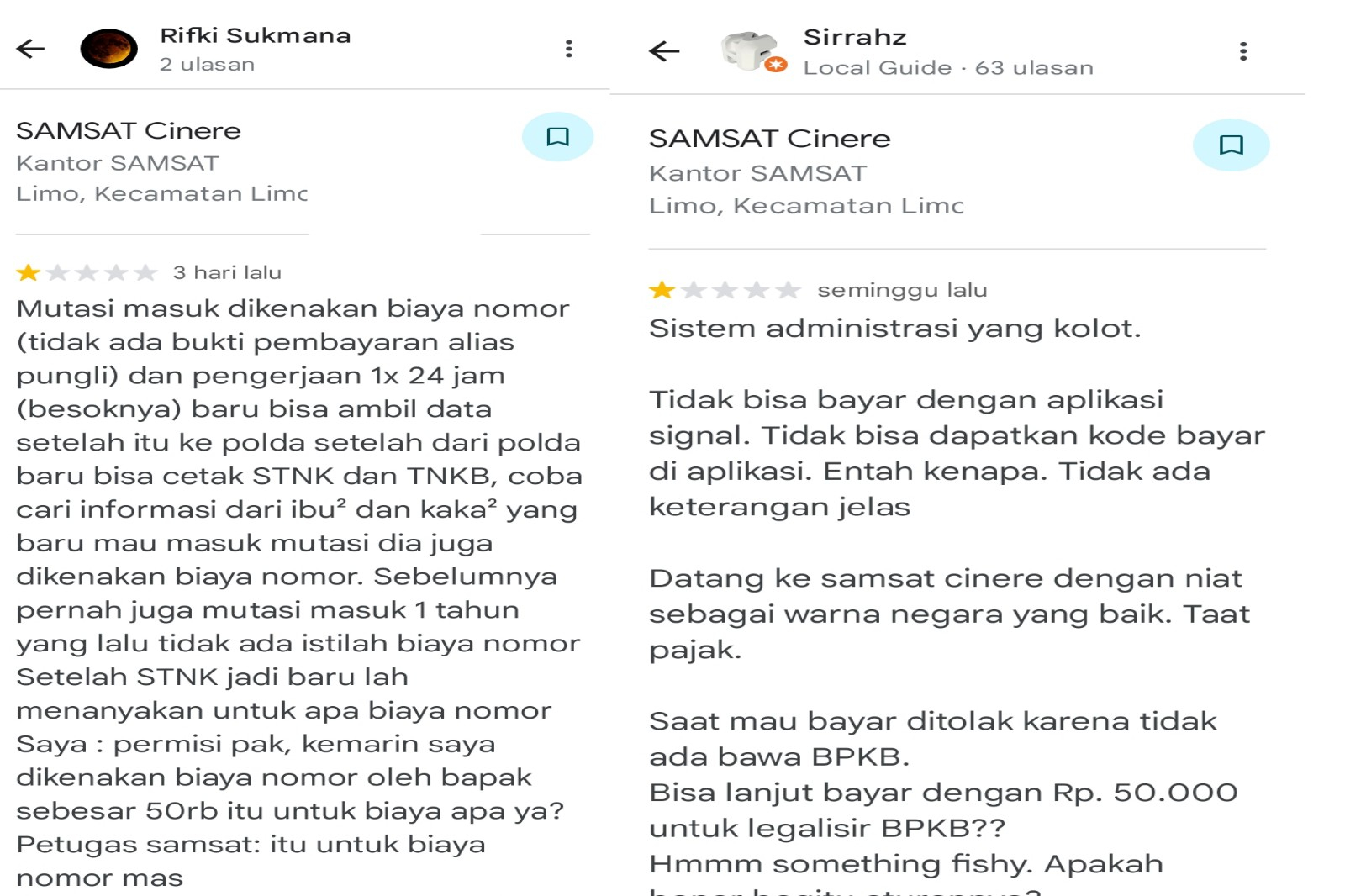 Cinere, Depok – Aduan masyarakat kembali mencuat terkait dugaan praktik pungutan liar (pungli) di Samsat Cinere dibawah naungan Polda Metro Jaya. Seorang wajib pajak melaporkan pengalaman buruknya melalui ulasan di laman Google Maps saat mengurus proses mutasi masuk kendaraan, di mana ia diminta membayar “biaya nomor” sebesar Rp50.000 tanpa tanda bukti pembayaran resmi.