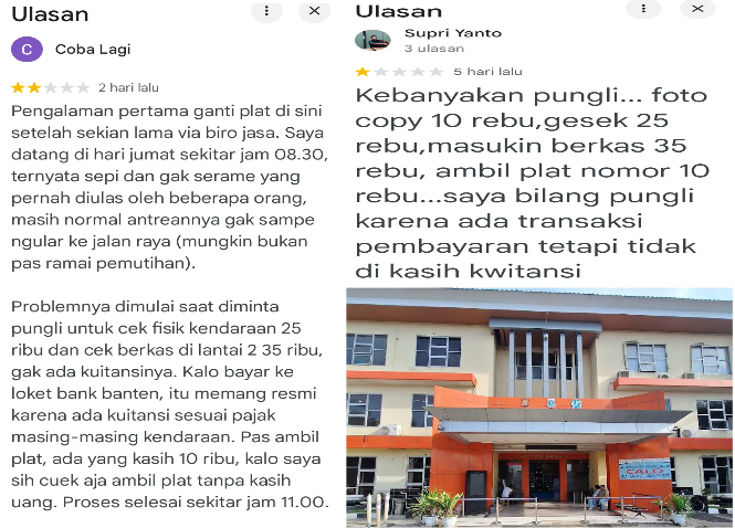 Dalam ulasan pertama, seorang warga mengaku diminta membayar pungli Rp25.000 untuk cek fisik kendaraan, dan Rp35.000 untuk pengecekan berkas di lantai dua, tanpa adanya tanda terima resmi.