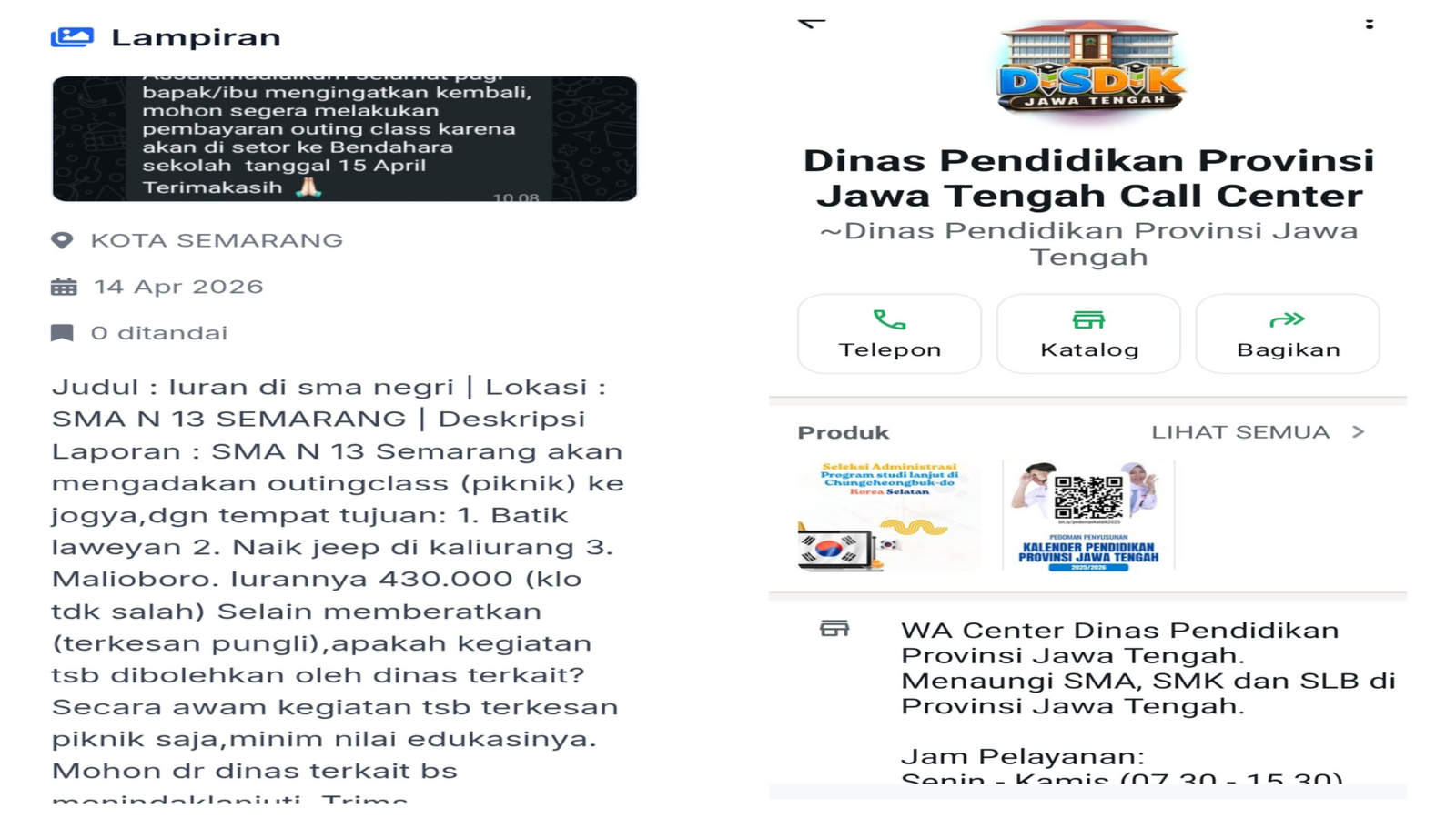 Semarang, Jawa Tengah – Praktik indikasi pungutan liar di sekolah kembali mencuat di Kota Semarang setelah munculnya aduan masyarakat melalui portal Laporgub Jawa Tengah terkait rencana kegiatan outing class di SMA Negeri 13 Semarang. Dalam laporan dengan nomor LGWS56261217 tertanggal 14 April 2026 tersebut, warga mengeluhkan biaya sebesar Rp430.000 untuk perjalanan ke Yogyakarta yang dinilai memberatkan serta minim nilai edukatif karena didominasi kegiatan wisata semata.