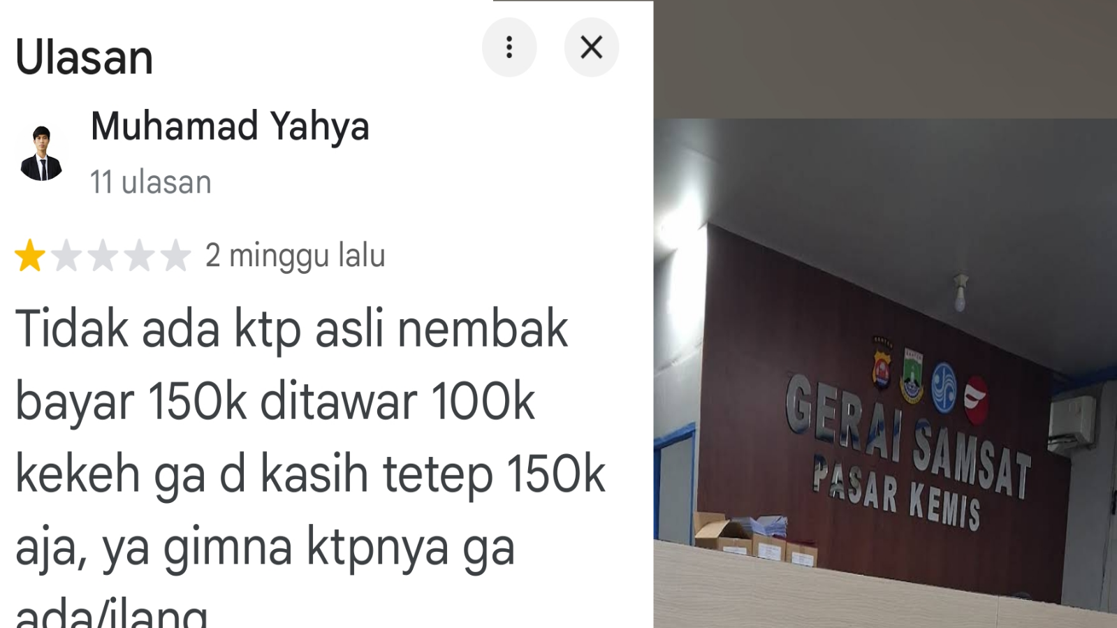 Melalui ulasan di Google Maps, akun atas nama Muhamad Yahya membeberkan pengalaman pahitnya saat mengurus pajak kendaraan di Gerai Samsat Pasar Kemis. Lantaran KTP aslinya hilang, ia diarahkan untuk membayar biaya “nembak” sebesar Rp150.000. Mirisnya, proses penarikan uang ilegal ini bahkan sempat diwarnai aksi tawar-menawar antara warga dan oknum tersebut, layaknya transaksi di pasar gelap.