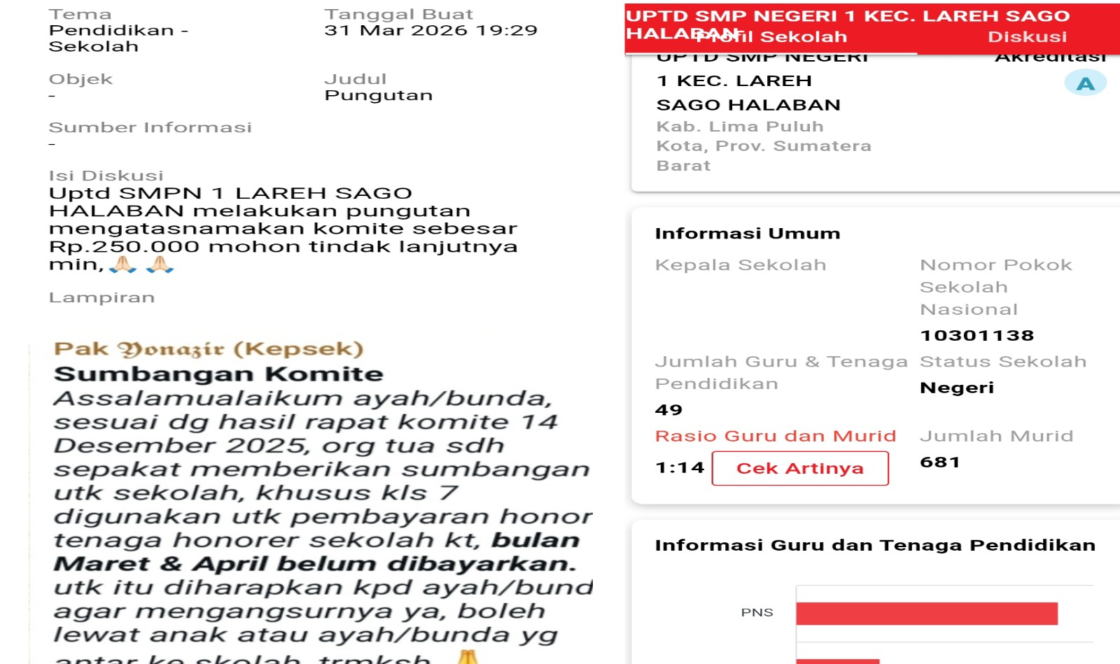 Limapuluh Kota, Sumatera Barat – Kasus dugaan pungutan liar (pungli) di UPTD SMPN 1 Lareh Sago Halaban, Kabupaten Limapuluh Kota, kini tengah menjadi sorotan publik. Melalui portal Jaga KPK, warga melaporkan adanya permintaan uang sebesar Rp250.000 per siswa dengan dalih “Sumbangan Komite” untuk membayar honorarium tenaga honorer yang diklaim menunggak pada bulan Maret dan April.