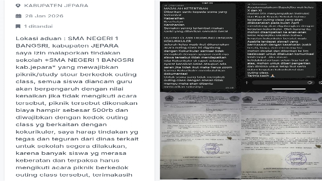 Jepara, Jawa Tengah – Dugaan pemaksaan kegiatan outing class di SMAN 1 Bangsri menjadi perhatian serius ketika seorang warga melaporkan kebijakan sekolah tersebut melalui kanal Laporgub. Dalam aduan bernomor LGIG88112349 dan LGWA79560595 yang diunggah pada 28 Januari 2026, warga mengeluhkan adanya kewajiban mengikuti piknik berbayar Rp490.000 dengan ancaman nilai akademik.