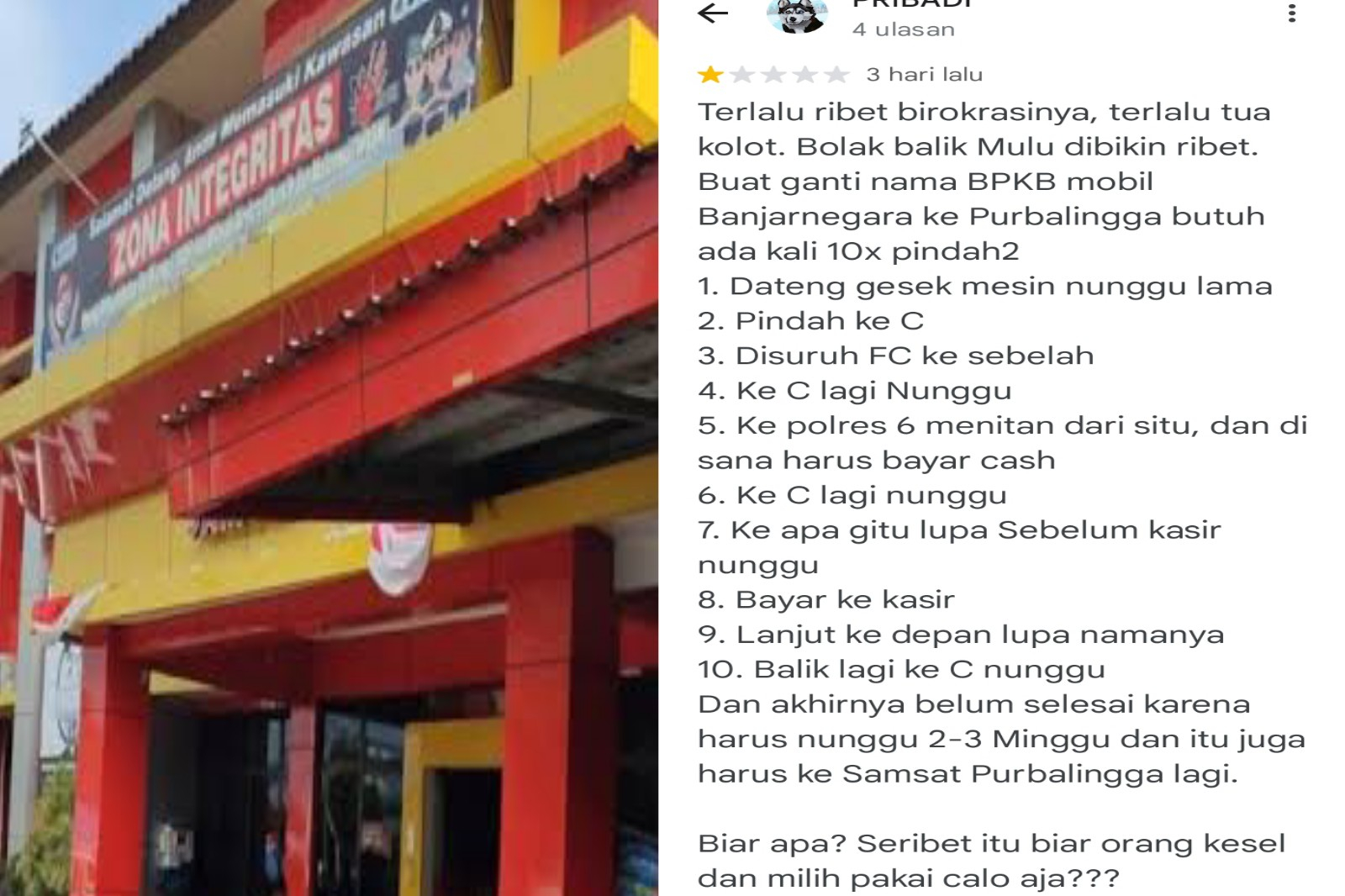 “Terlalu ribet birokrasinya, terlalu tua kolot. Bolak-balik mulu dibikin ribet. Buat ganti nama BPKB mobil Banjarnegara ke Purbalingga butuh ada kali 10x pindah-pindah…”