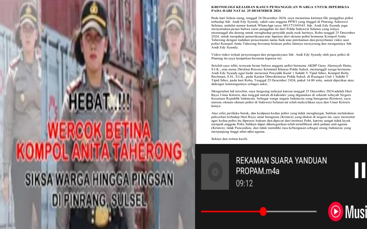 Pada Selasa siang, 24 Desember 2024, Wilson Lalengke selaku ketua Umum PPWI (Persatuan Pewarta Warga Indonesia) menerima file panggilan polisi untuk Andi Edy Syandy, anggota PPWI yang tinggal di Pinrang, Sulawesi Selatan. Surat panggilan itu meminta Andi hadir pada 25 Desember 2024 untuk menjalani pemeriksaan sebagai saksi atas laporan pencemaran nama baik oleh Kompol Anita Taherong. Tuduhan tersebut terkait perekaman dan penyebaran video penyerangan terhadap Andi yang dilakukan oleh Kompol Anita bersama sejumlah polisi lainnya.