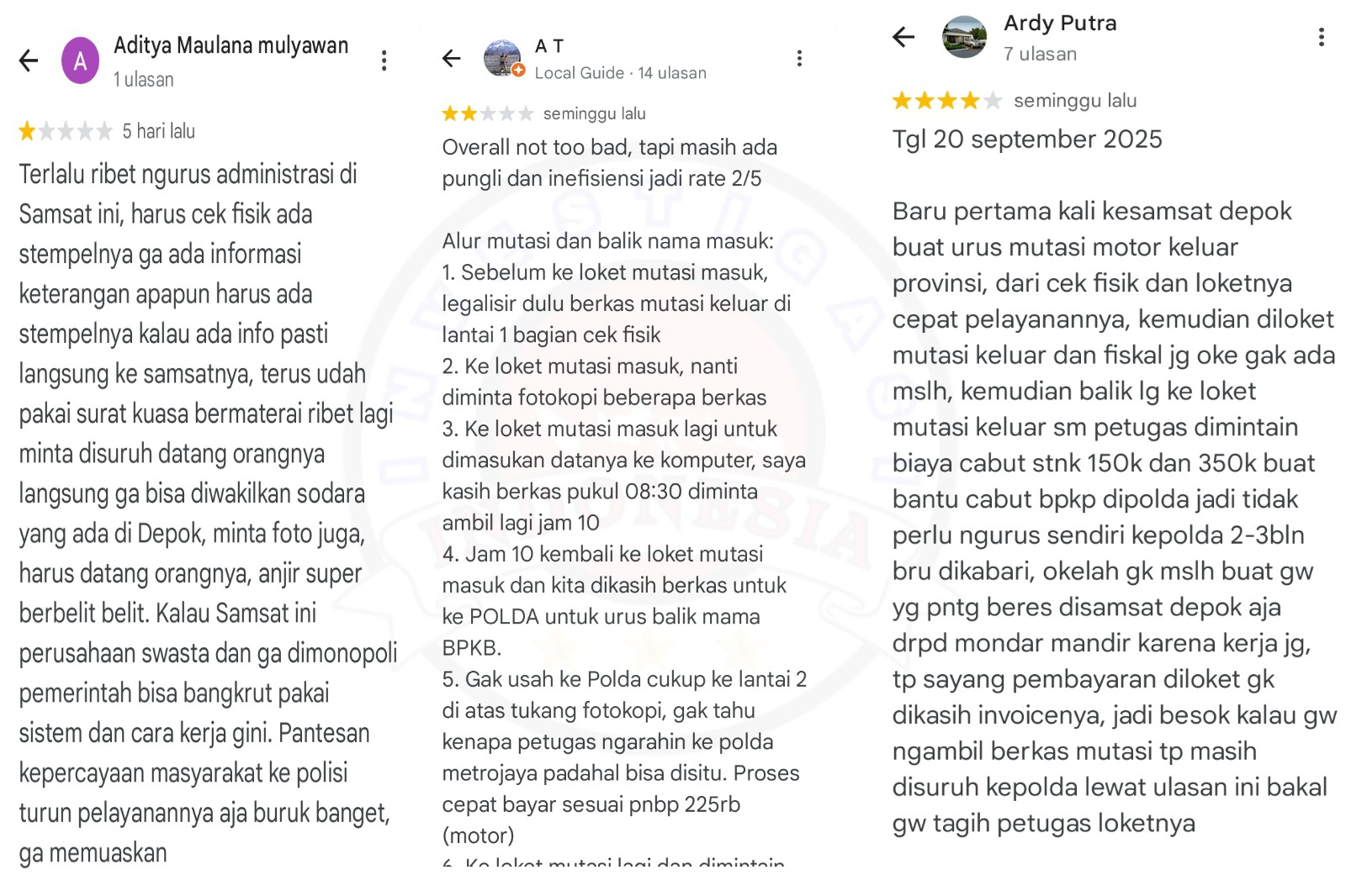 Warga lainnya memberi nilai 2 dari 5 untuk layanan Samsat Depok. Ia menyebut alur terlalu panjang dan tidak efisien. Yang mencolok adalah dugaan pungli sebesar Rp70.000 di loket mutasi, dan adanya petugas yang meminta uang secara tidak resmi saat pengambilan plat nomor. “Beberapa orang ngasih uang, aku enggak, dan petugasnya diem aja. Tapi pas udah sepi, nama saya dipanggil, dipintain uang seikhlasnya dengan nada pelan,” tulis warga lainnya.