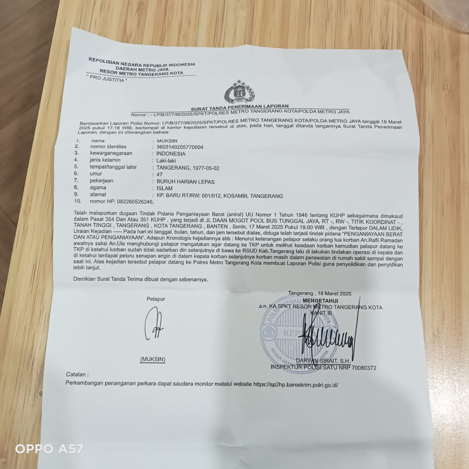 Laporan resmi akhirnya diterbitkan dengan Nomor: LP/B/377/III/2025/SPKT/Polres Metro Tangerang Kota/Polda Metro Jaya. Saat dikonfirmasi melalui pesan WhatsApp, Kanit Reskrim Polsek Tangerang Kota, Ronald, membenarkan bahwa kasus ini telah dilimpahkan ke Polres Metro Tangerang Kota.