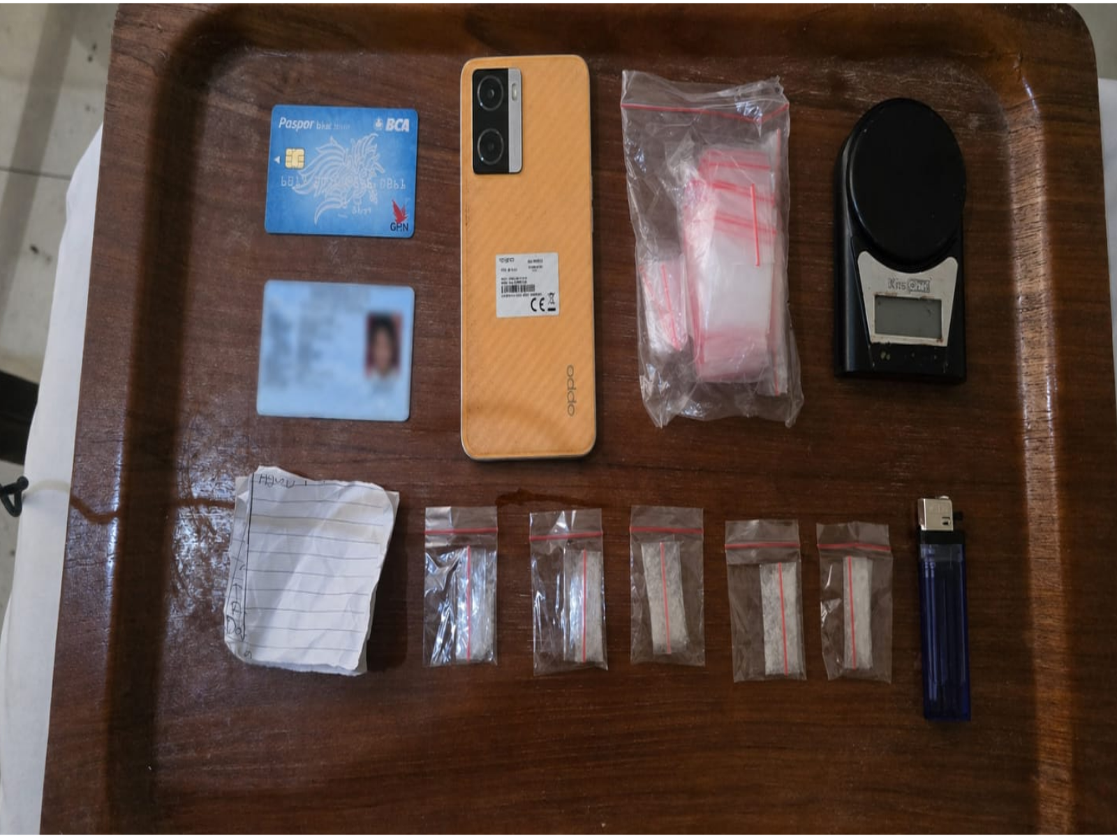 Selain barang haram, polisi juga mengamankan alat pendukung seperti timbangan digital, plastik klip, handphone, hingga korek api modifikasi yang diduga digunakan untuk konsumsi.