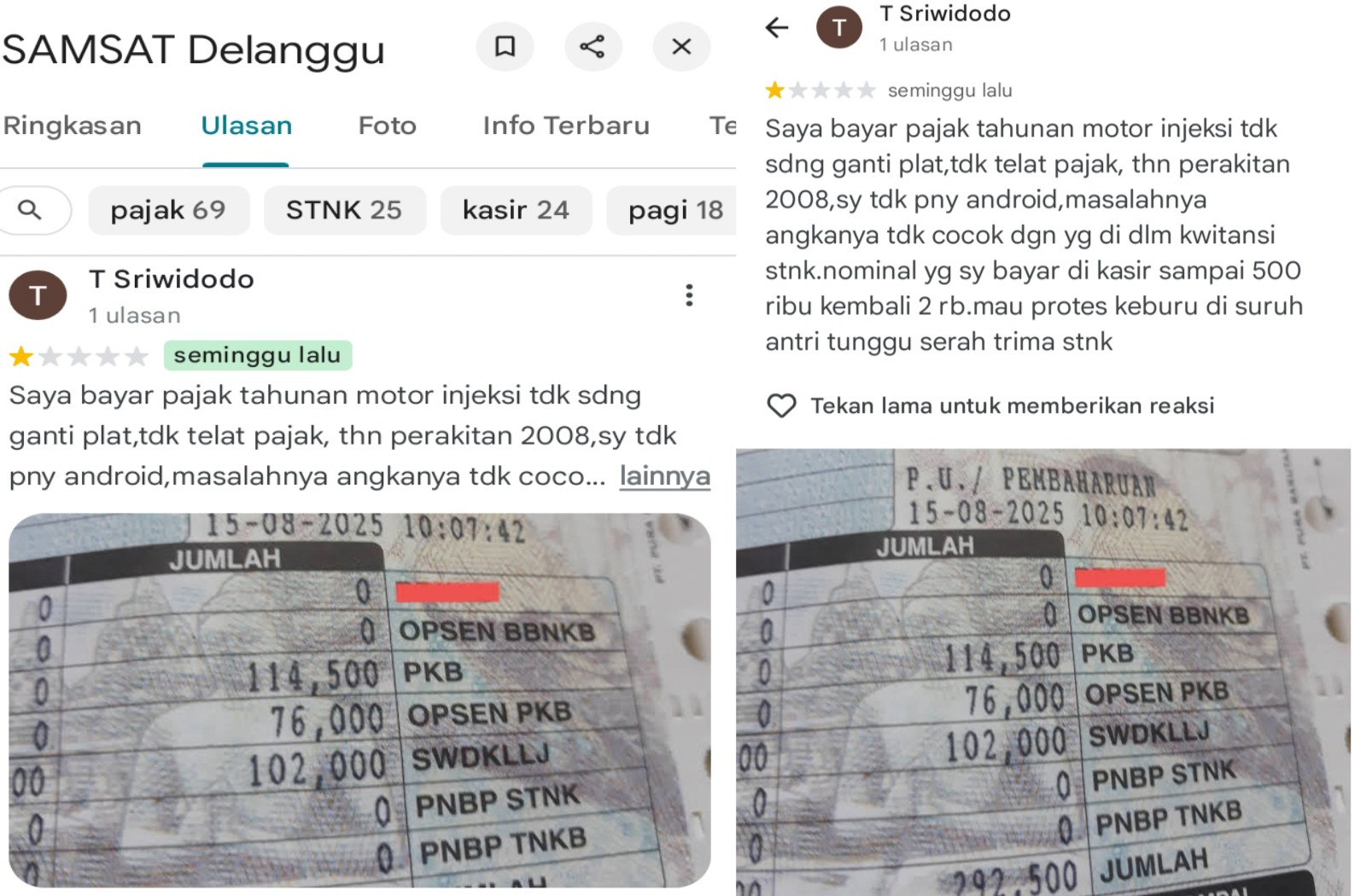 Namun, saat berada di loket pembayaran, ia dikenakan tarif hampir Rp500.000 dan hanya dikembalikan uang kembalian sebesar Rp2.000. Ketika STNK yang telah diperbarui diterima, ia menyadari bahwa nominal yang tercantum dalam kwitansi STNK tidak mencerminkan jumlah yang ia bayarkan di kasir.