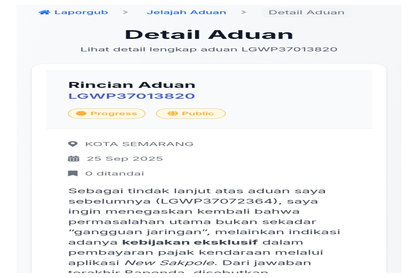 Semarang, Jawa Tengah — Seorang warga Kota Semarang kembali mengajukan aduan resmi melalui platform Lapor Gub terkait layanan digital pembayaran pajak kendaraan bermotor melalui aplikasi New Sakpole. Dalam aduan dengan nomor referensi LGWP37013820, warga tersebut menegaskan bahwa permasalahan yang dialaminya bukan sekadar gangguan teknis, melainkan dugaan adanya praktik eksklusivitas dalam metode pembayaran, yang dinilai tidak inklusif dan berpotensi merugikan wajib pajak.