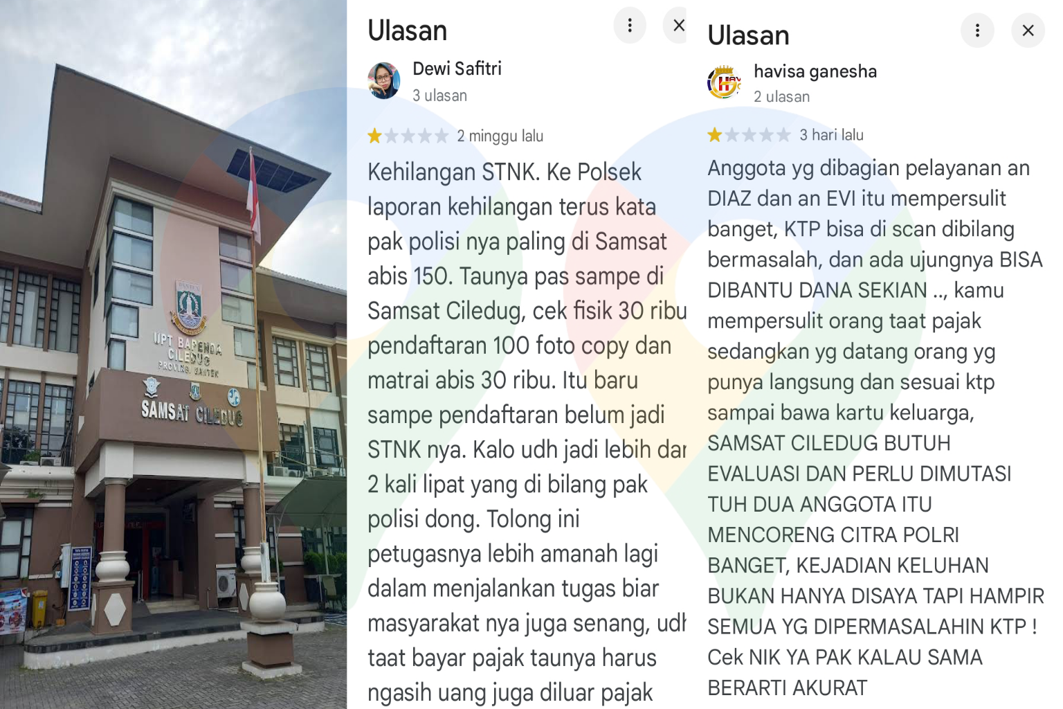 “Anggota yang di bagian pelayanan berinisial D dan E itu mempersulit banget. KTP bisa di-scan dibilang bermasalah, dan ada ujungnya bisa dibantu dengan dana sekian. SAMSAT Ciledug butuh evaluasi dan perlu mutasi terhadap dua anggota itu karena mencoreng citra Polri banget,” tulis Havisa dalam ulasannya.