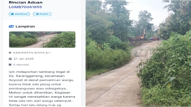 Boyolali, Jawa Tengah – Isu mengenai dugaan Galian C ilegal Karanggeneng kini mencuat setelah warga menyampaikan aduan melalui kanal resmi Laporgub dengan nomor LGMB70061855. Meski keresahan masyarakat sudah dilaporkan sejak 27 Januari 2026, hingga saat ini respon dari otoritas terkait dinilai masih minim dan belum membuahkan tindakan nyata.