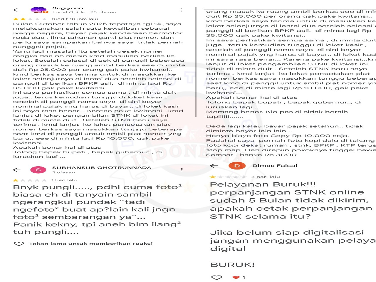 “Setelah gesek nomor rangka dan mesin, lalu berkas dimasukkan ke loket, saya diminta uang Rp25.000 tanpa kwitansi. Di lantai dua, saat menerima BPKB asli, diminta lagi Rp35.000 tanpa bukti pembayaran,” tulisnya.