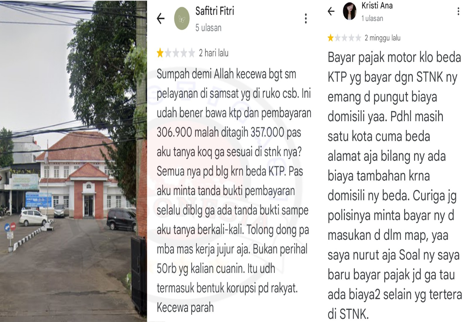 “Sumpah demi Allah kecewa banget sama pelayanan di samsat yang di ruko CSB. Ini udah benar bawa KTP dan pembayaran Rp306.900, malah ditagih Rp357.000. Pas ditanya, katanya beda KTP. Minta tanda bukti pembayaran, selalu dibilang nggak ada. Tolong dong kerja jujur. Ini udah termasuk bentuk korupsi pada rakyat. Kecewa parah.”