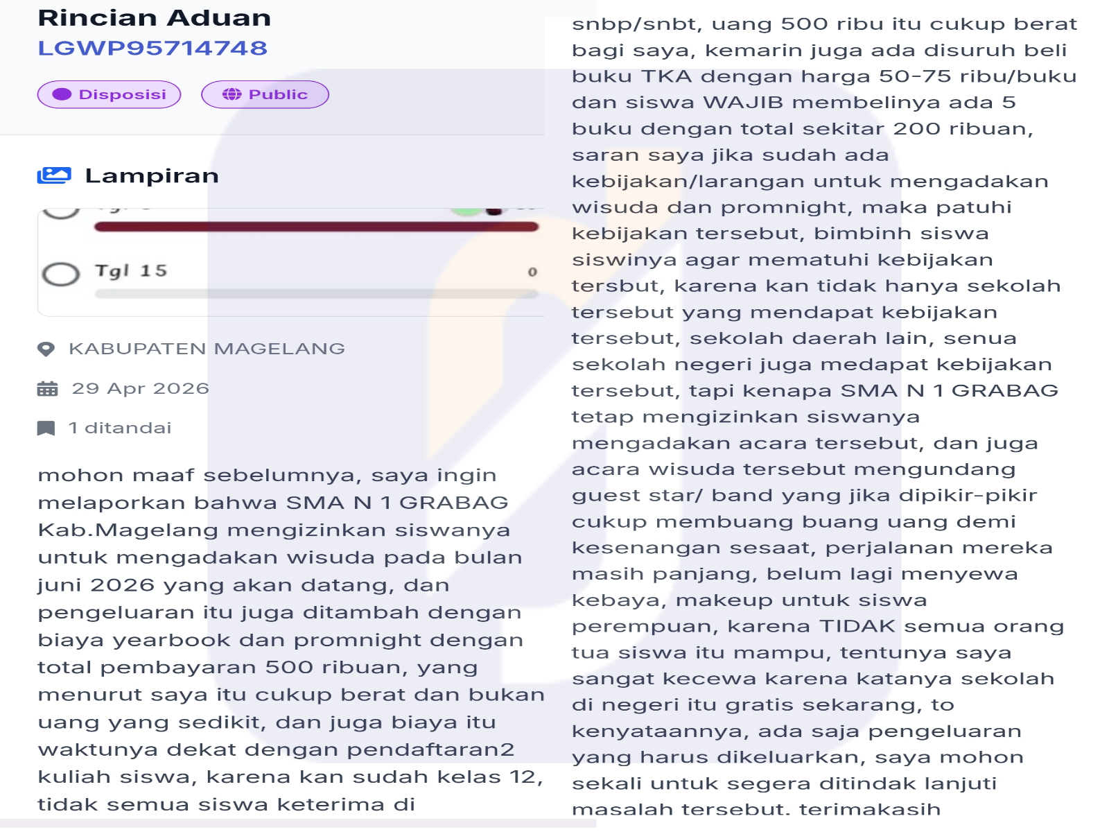 “Mohon maaf sebelumnya, saya ingin melaporkan bahwa SMA N 1 GRABAG Kab.Magelang mengizinkan siswanya untuk mengadakan wisuda pada bulan juni 2026 yang akan datang, dan pengeluaran itu juga ditambah dengan biaya yearbook dan promnight dengan total pembayaran 500 ribuan, yang menurut saya itu cukup berat dan bukan uang yang sedikit,” tulis pelapor dalam laman resmi LaporGub.
