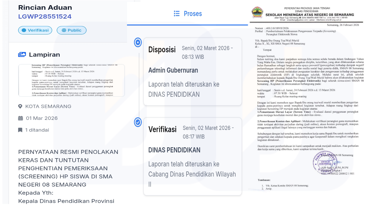 Semarang, Jawa Tengah – Kebijakan pemeriksaan perangkat elektronik atau screening HP siswa di SMA Negeri 08 Semarang memicu gelombang protes keras dari masyarakat. Aduan yang masuk melalui kanal Laporgub dengan nomor registrasi LGWP28551524 pada 01 Maret 2026, mendesak pembatalan kebijakan tersebut karena dinilai melanggar privasi dan hak konstitusional peserta didik.