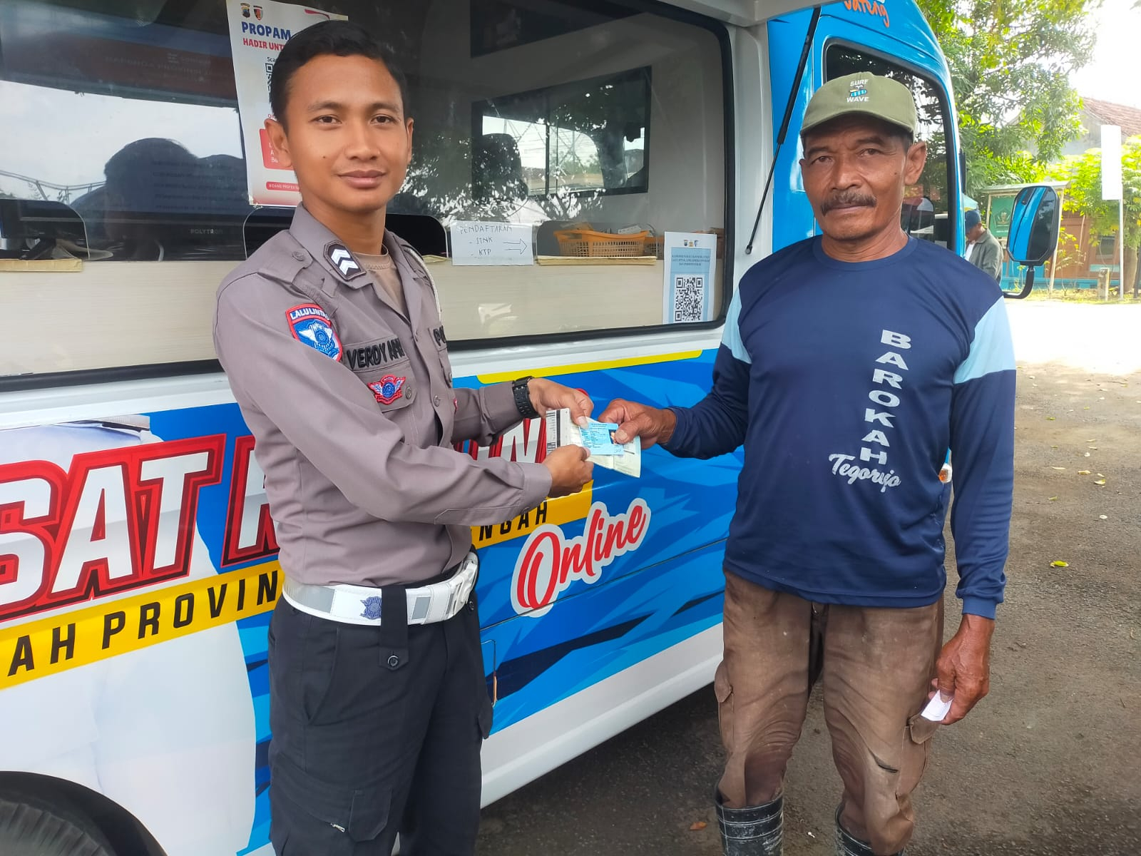 Kendal, Jawa Tengah — Anggota Satlantas Polres Kendal, Briptu Verdy, menunjukkan komitmen pelayanan prima kepada masyarakat saat bertugas di Samsat Keliling (Samkel) Kecamatan Pegandon, Kamis (20/11/25).