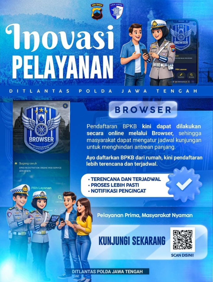 “Ayo daftarkan BPKB dari rumah. Kini pendaftaran lebih terencana dan terjadwal melalui sistem BROWSER,” tulis rilis resmi Ditlantas Polda Jateng sebagaimana tertera dalam sosialisasi terbarunya.