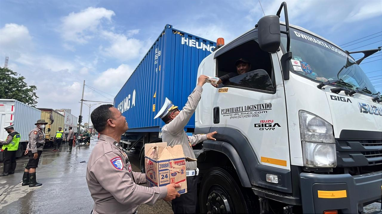 Di balik suasana darurat, muncul kepedulian yang menghangatkan. Di sela kesibukan mengatur arus lalu lintas dan membantu warga, AKBP Yunaldi bersama personel Satlantas turut menggelar kegiatan “Jumat Berkah”, membagikan makanan dan minuman kepada para sopir truk yang sudah berjam-jam terjebak macet di kawasan Kaligawe.