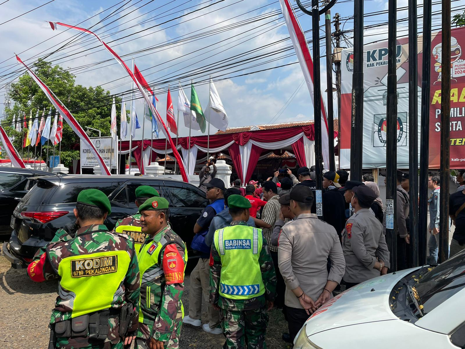 Pekalongan, Jawa Tengah – Personil gabungan TNI-Polri melaksanakan pengamanan pendaftaran calon Bupati dan Wakil Bupati Kabupaten Pekalongan di kantor KPU Kabupaten Pekalongan pada 28 dan 29 Agustus 2024. Langkah ini diambil untuk memastikan setiap tahapan Pilkada berjalan dengan lancar dan aman.
