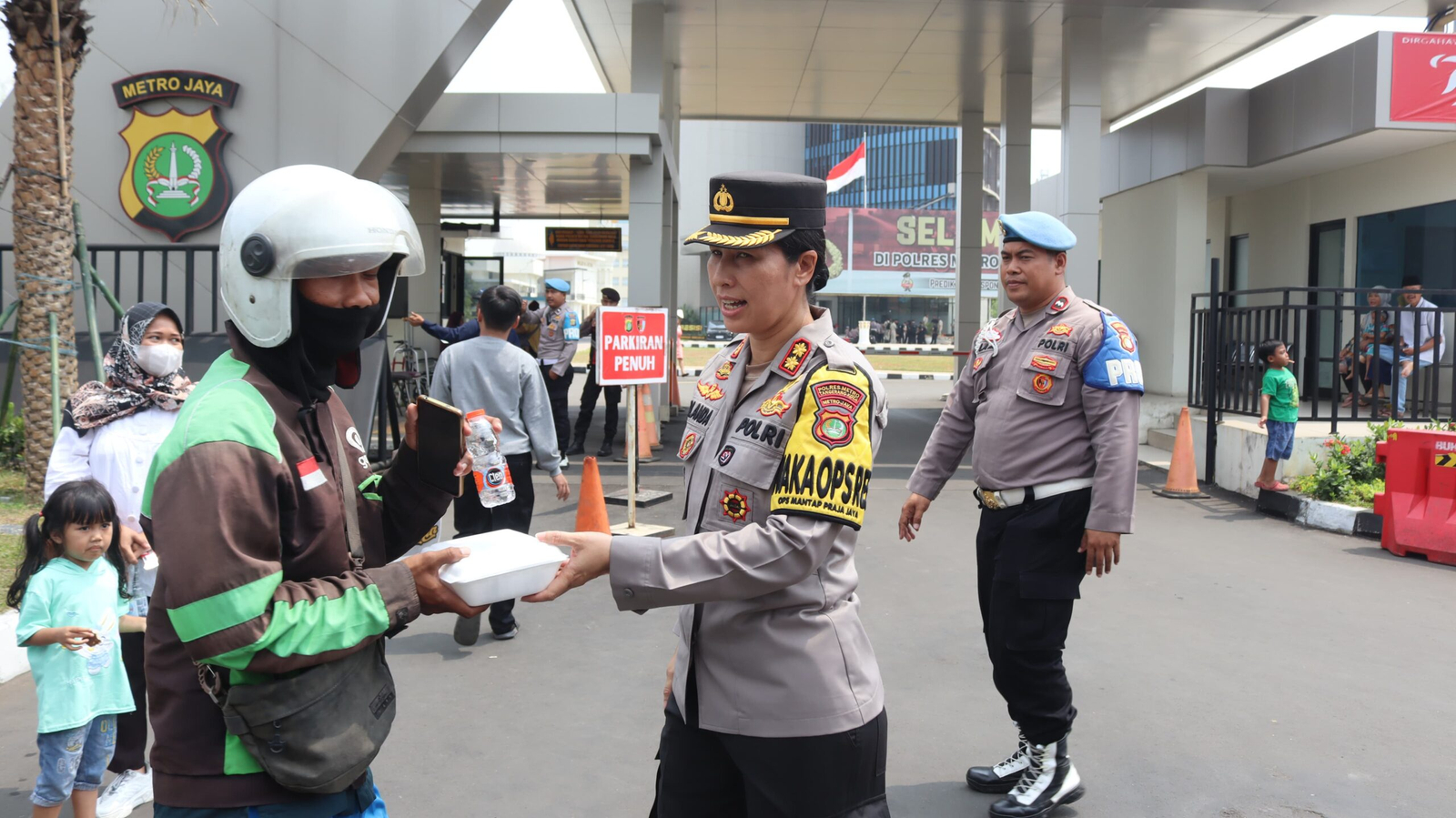 Polres Metro Tangerang Kota membagikan makanan dan minuman gratis bagi para pejalan dengan kendaraan bermotor jelang sholat jumat di Jl. Perintis Kemerdekaan 2 dan di Jl. Raya Daan Mogot No. 52, Jumat (20/09/2024) pagi.